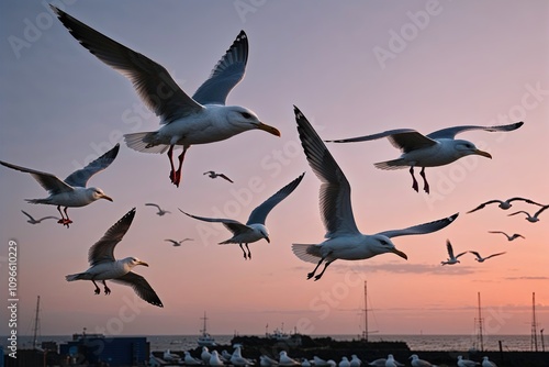 Seagulls Soaring at Dusk a Vibrant Display of Wildlife in the Evening Sky