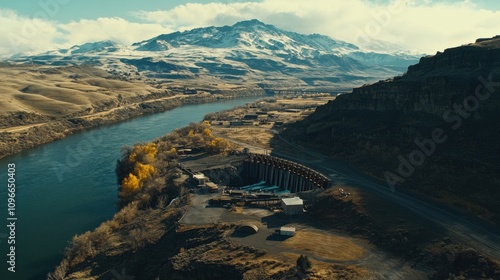 Water rushing through the turbines of a hydroelectric dam, with picturesque mountains and a calm river creating a serene scene.