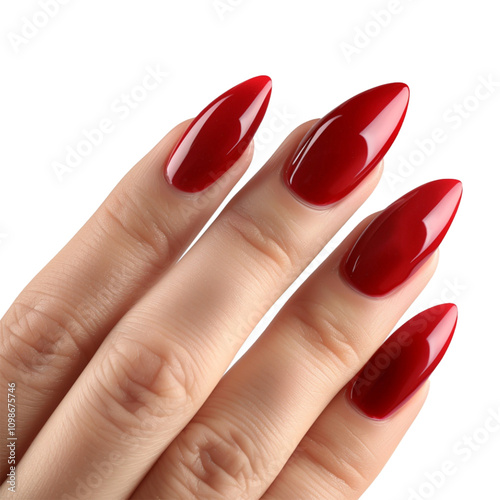 Kobieca, biała dłoń. Czerwone, długie, błyszczące paznokcie, transparentne tło