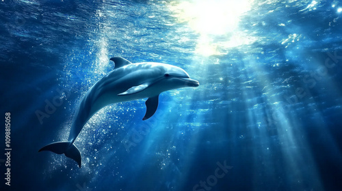 Delfin majestatycznie przepływający pod powierzchnią oceanu, w otoczeniu rozproszonych promieni słonecznych.