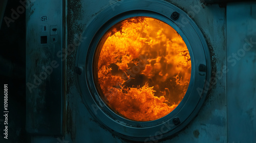 Widok biomasy w trakcie termicznego rozkładu, emitującej jasny pomarańczowy blask widoczny przez wziernik.