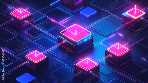 A futuristic blockchain graphic, featuring luminous blocks interconnected and arranged in a regular pattern, The visualization simplifies the concept of a digital ledger