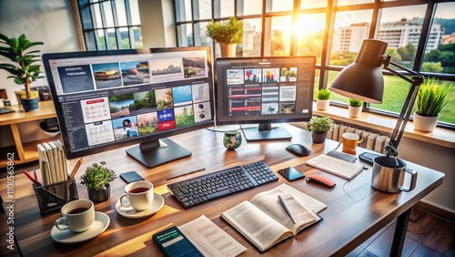 Aerial View of a Public Relations Specialist's Desk with Multiple Computer Screens Displaying Media Relations and Press Release Content in a Modern Office Environment