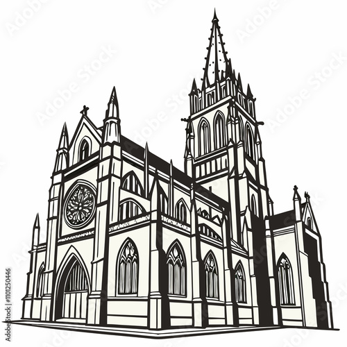A detailed drawing of a cathedral featuring an impressive clock tower against a clear sky.