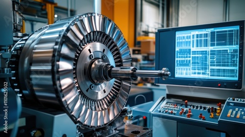 A turbine rotor balancing machine in operation, fine-tuning a turbocharger component. The setup, sensors, and digital displays underscore the expertise required in balancing and repair.