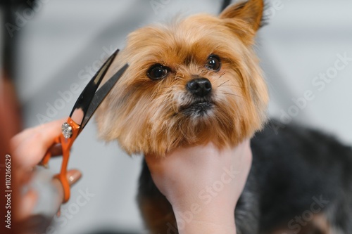 Yorkshire in the grooming salon. Caring for little friends. High quality photo