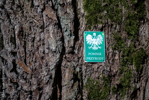 Pomnik przyrody - prawem chroniony, tabliczka informująca umieszczana na pniach cennych i chronionych drzew