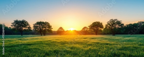 Idyllic sunset over a green field with silhouetted trees on the horizon.