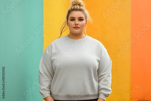 Portrait of a young curvy woman wearing a sweatshirt against a vibrant wall background