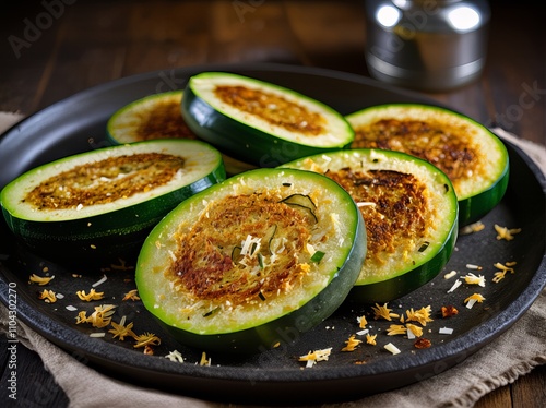 Świeże plasterki cukinii posypane startym parmezanem i kolorowymi warzywami tworzą zdrowe i atrakcyjne wizualnie danie.