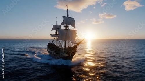 Crew members of the Flying Dutchman stand at attention as they gaze at the stunning sunset, navigating through uncharted waters