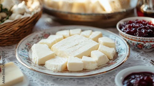 A plate of sliced cheese surrounded by various accompaniments on a decorative table setting.
