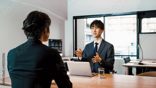 中小企業の採用面接の為、オフィスで個人面談と面接をする人事の男性