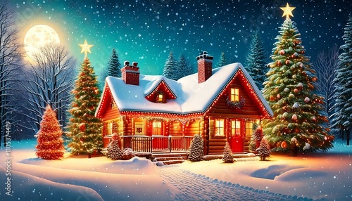 Zimowy, bożonarodzeniowy krajobraz z ośnieżonym, oświetlonym domem otoczonym pięknymi choinkami. Świąteczne tło.