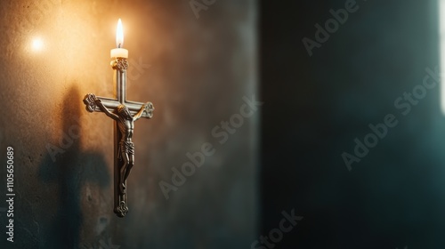 religious home decor, a decorative crucifix on a cozy rooms mantelpiece, softly lit by a candle, emanating a warm and peaceful ambiance