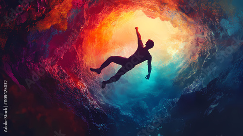 A man is seen falling into a large, dark abyss set against a colorful background, symbolizing the plunge into the unknown or a deep state of contemplation. Abyssal. Illustration