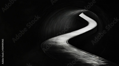 Black-and-white image of a road leading to a tunnel with a bright light at its end