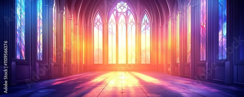 A vibrant, illuminated interior of a cathedral showcasing beautiful stained glass.