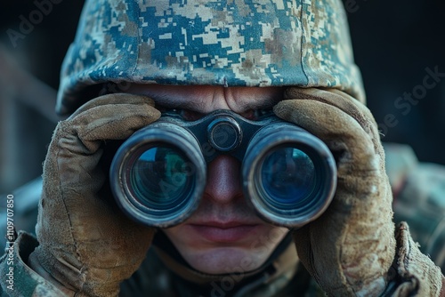 Soldier wearing camouflage uniform and gloves using binoculars on a reconnaissance mission in a war zone