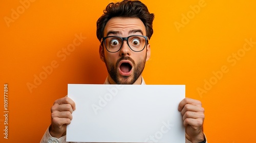 Man Holding Up Empty White Sign with Comical Expression, Humor and Playful Gesture