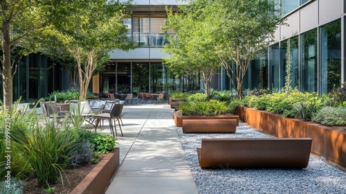 Sunlit courtyard with rust-colored planters, seating, and lush greenery.