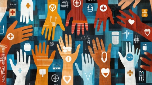 An abstract image of equity in healthcare with a mosaic of different hands holding medical symbols, symbolizing access to health services for all, minimalist composition