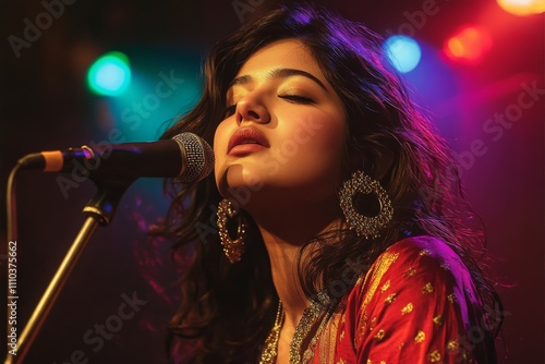 Young woman singing into microphone stage She is indian