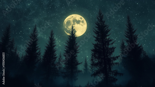 Wysokie sosny jako ciemne, majestatyczne kształty pod jasnym światłem księżyca, otoczone morzem gwiazd, tworzące harmonijny i tajemniczy nocny pejzaż.
