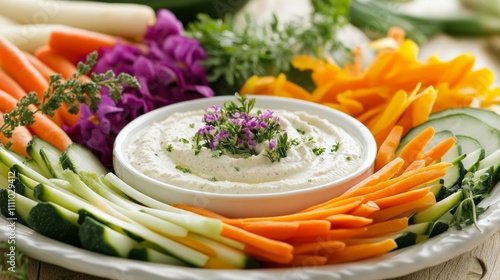 Photo of, A platter of colorful vegetable crudité served with hummus and ranch dip, Crudité platter centered