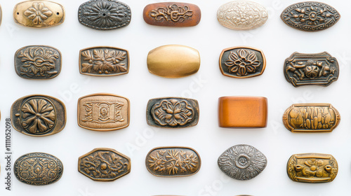 A diverse collection of intricately designed and textured vintage belt buckles, showcasing various shapes and patterns, laid out in a neat grid formation.
