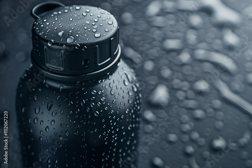 Matowa, czarna butelka wielokrotnego użytku pokryta kroplami wody, ustawiona na ciemnym tle z mokrą powierzchnią.
