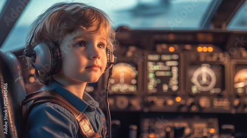 Młody przyszły pilot w kokpicie, z założonym zestawem słuchawkowym, z fascynacją w oczach odkrywa świat lotnictwa.