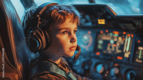 Młody przyszły pilot w kokpicie, z założonym zestawem słuchawkowym, z fascynacją w oczach odkrywa świat lotnictwa.