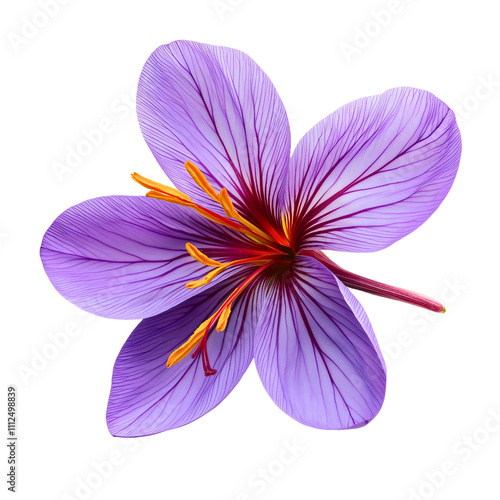 Fresh saffron crocus flower blooming isolated, natural aromatic spice plant petals, organic exotic cooking ingredient blossom in purple pink color