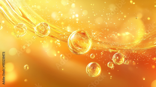 golden bubbles on yellow orange water, soft and smooth abstract background for cosmetics and skincare