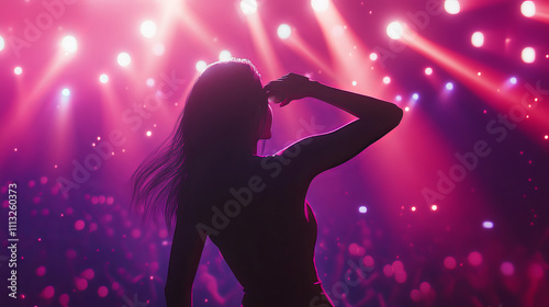 Music stage game screen. Show performance begin with lighting and audience. Concert illuminated by spotlights. Female idol dancing on the dance floor. Superstar posing