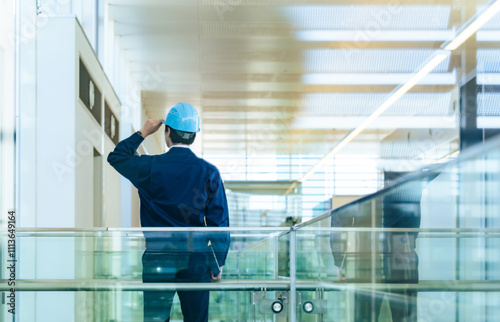 エンジニア、工場、男性、倉庫、ゼネコン、点検、メンテナンス、ビル、作業員、チェック、確認、安全、防災、建設、検査、工事、現場、建築士、設計士、日本人、背中、後ろ姿、ビジネス、視察、見学、産業、製造業、物流、公共事業、作業服、インフラ、警備、警備員、見守る、監視、保守、管理、ビルメン、人材、仕事、職業、屋内、オフィス、挑戦、チャレンジ、ヘルメット、施設、設備、耐震、人物