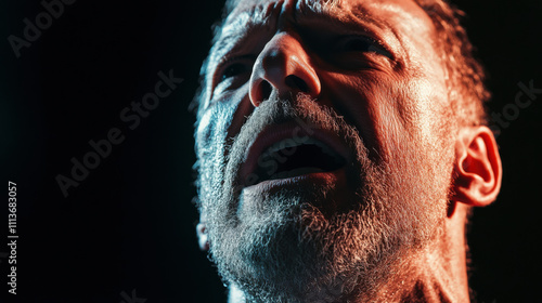 Intense actor expression during dramatic monologue rehearsal, showcasing emotion and passion. close up highlights facial details and lighting effects