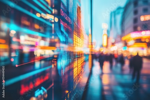 Vibrant city street reflections with blurred neon lights and urban energy.