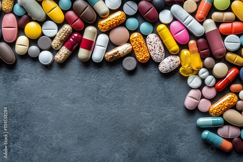 Colorful assortment of various pills and capsules on dark background