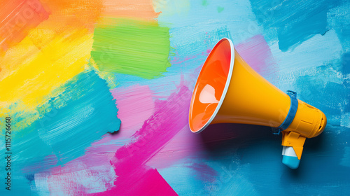 Dynamiczna kompozycja z intensywną paletą kolorów i megafonem, który skutecznie przekazuje wiadomości reklamowe.
