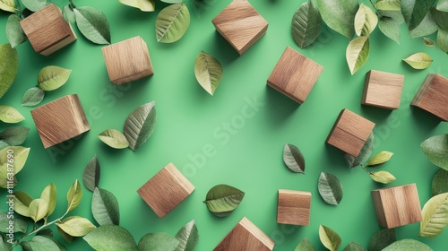 Wooden cubes representing ESG concepts surrounded by green leaves on a vibrant background highlighting environmental sustainability and governance.