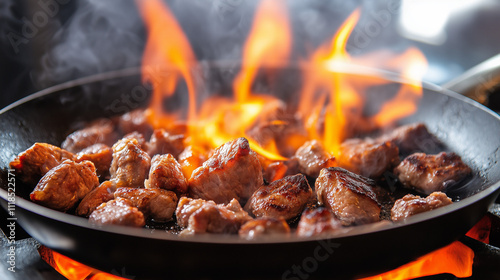 Mięso na patelni intensywnie się smaży nad płomieniem, z widocznymi kropelkami tłuszczu i unoszącą się parą, która potęguje wrażenie intensywnego ciepła.