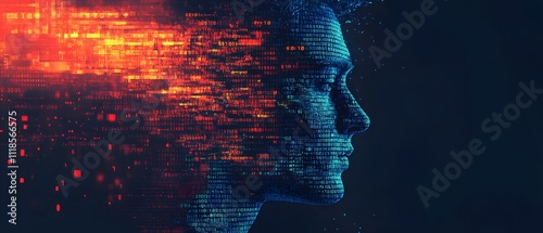 Abstract representation of human profile with digital data streams, symbolizing technology integration, artificial intelligence, and the future of human evolution in a digital age