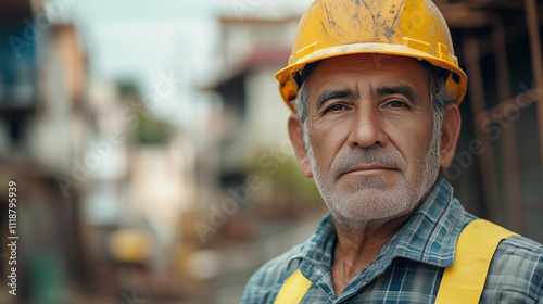 Starszy pracownik budowlany pochodzenia latynoskiego, z wyrazem doświadczenia na twarzy, obserwuje prace w rozwijającym się obszarze pełnym nowych budynków.