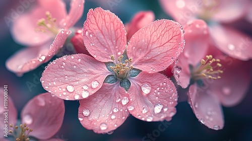 Raindrops gently fall upon the delicate blossoms of an apple tree