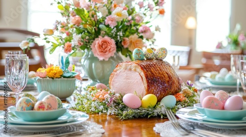 A spring-themed dinner table with pastel-colored decorations, Easter eggs, a glazed ham, and fresh flowers as the centerpiece