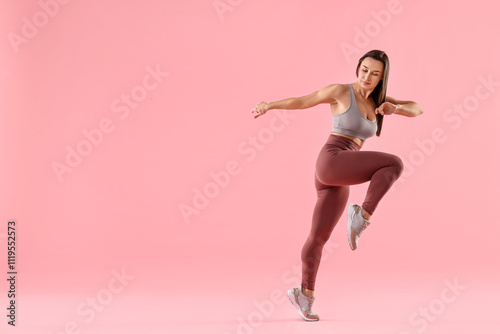 Woman in gym clothes doing exercise on pink background, space for text