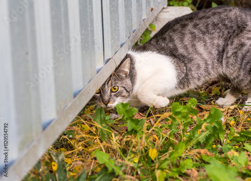 Biało-szary kot o złotych oczach przechodzi pod blaszanym płotem. Kot podwórkowy (zwykły kot dachowy) patrzy, nieco przestraszony, spod krawędzi blaszanego płotu.