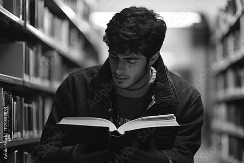 Student engrossed in book enjoying quiet solitude in library